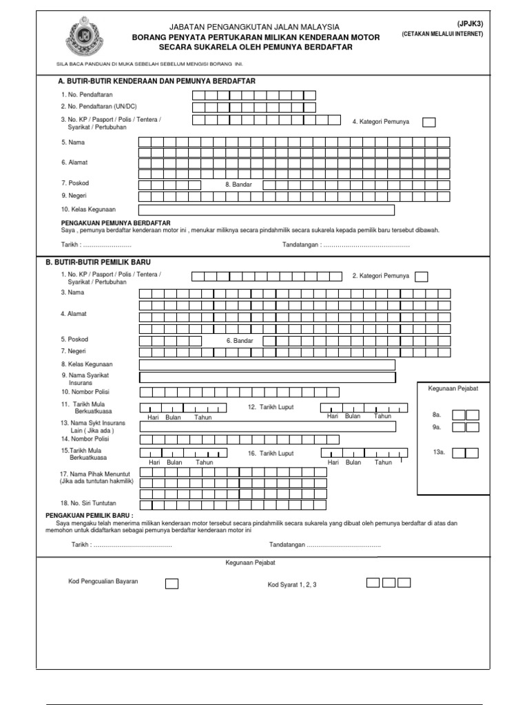 Current owners name Identity card number Vehicle registration number Address New owners particulars To download the JPJ K3 form please click the link below. Isi borang tukar nama JPJ Borang Penyata Pertukaran Milikan Kenderaan Motor Secara Sukarela Oleh Pemunya Berdaftar JPJ K3. Isi Borang Penyata Pertukaran Milikan Kenderaan Motor Secara Sukarela Oleh Pemunya Berdaftar JPJ K3 kepada pemilik baru.