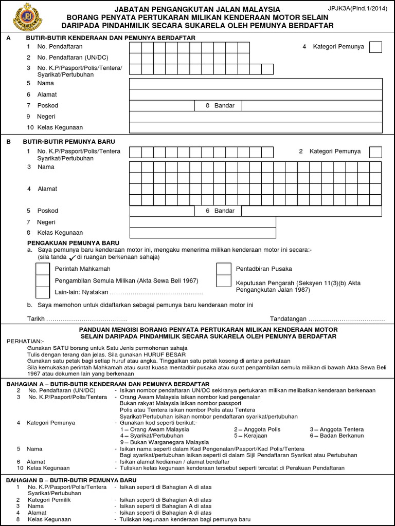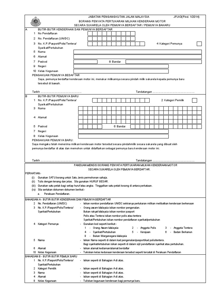 Borang penyata pertukaran milikan kenderaan motor secara sukarela oleh pemunya berdaftar jpj k3. PANDUAN MENGISI BORANG PENYATA PERTUKARAN MILIKAN KENDERAAN MOTOR SECARA SUKARELA OLEH PEMUNYA BERDAFTAR Gunakan satu petak bagi setiap huruf atau angka. Korang perlukan maklumat-maklumat seperti nama nombor kad pengenalan serta alamat pemilik asal dan pemilik baharu untuk mengisi borang ini.
